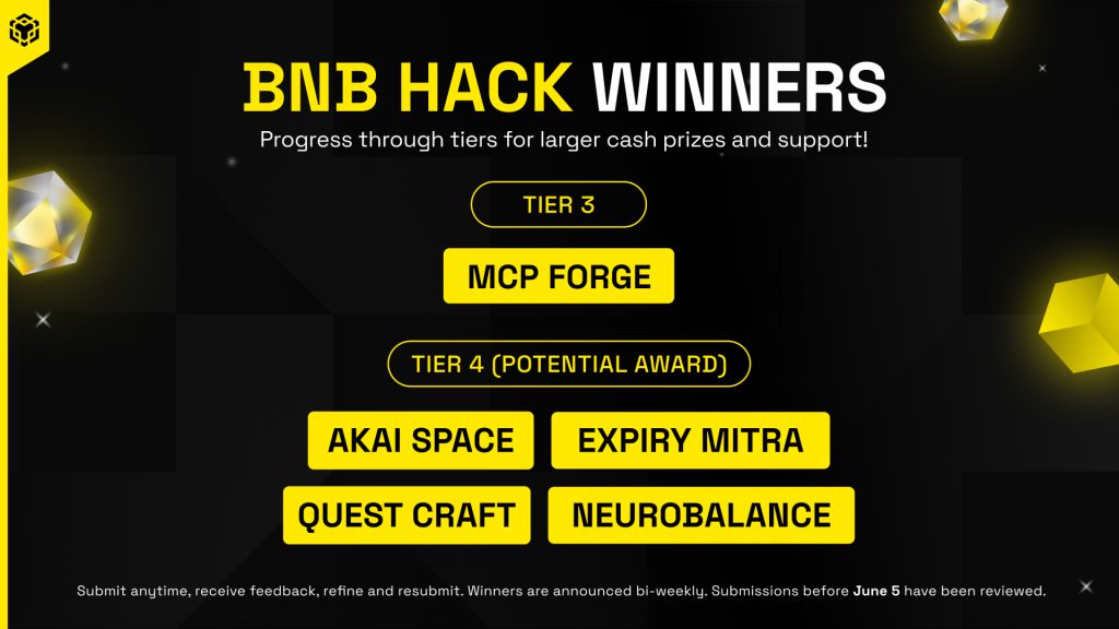 BNB Chain, the community-driven blockchain ecosystem, today announced the winners of its latest BNB Hack batch, continuing to recognize innovation across AI, DeSoc, DeSci, DePIN, and other Web3 categories. The June 12 batch includes one standout project, MCPForge, selected as a Tier 3 winner, reflecting strong traction, technical development, and potential for monetization.